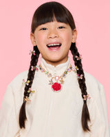 - Includes a statement necklace, rosebud clip-on earrings, and two adjustable rings